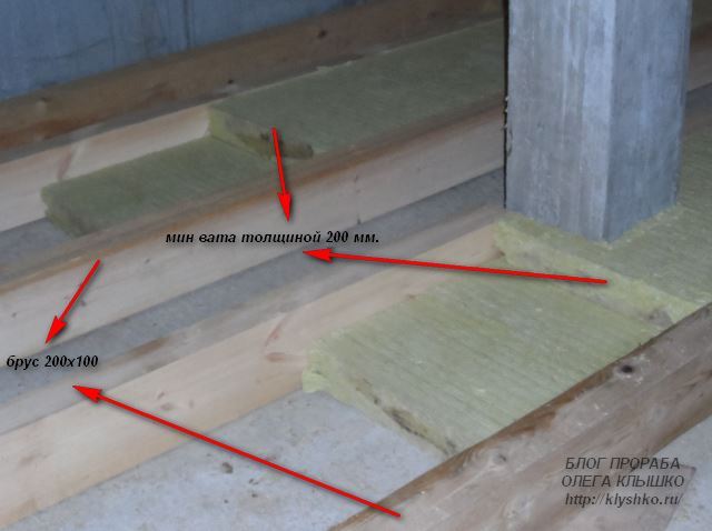 Брус укладывали в ряд на всю ширину здания. Расстояние между рядами 60 сантиметров, ширина утеплителя, к бетонному основанию брус не крепили.